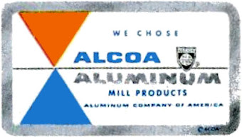 New trademarks introduced at this time were often simple and abstract, replacing cluttered old shields and seals. Not so this time, as Alcoa had already gone through this process in the mid-50s. At the time a firm known as Harley Earl Associates had designed a striking new mark consisting of two triangles. Unfortunately, the application wasn't as pure. The two triangles were typically enclosed by a rectangle with rounded corners with the brand mark, some additional text and, oh, a miniature version of the old shield symbol. In addition, it was potentially not unique enough to be trademarked.
