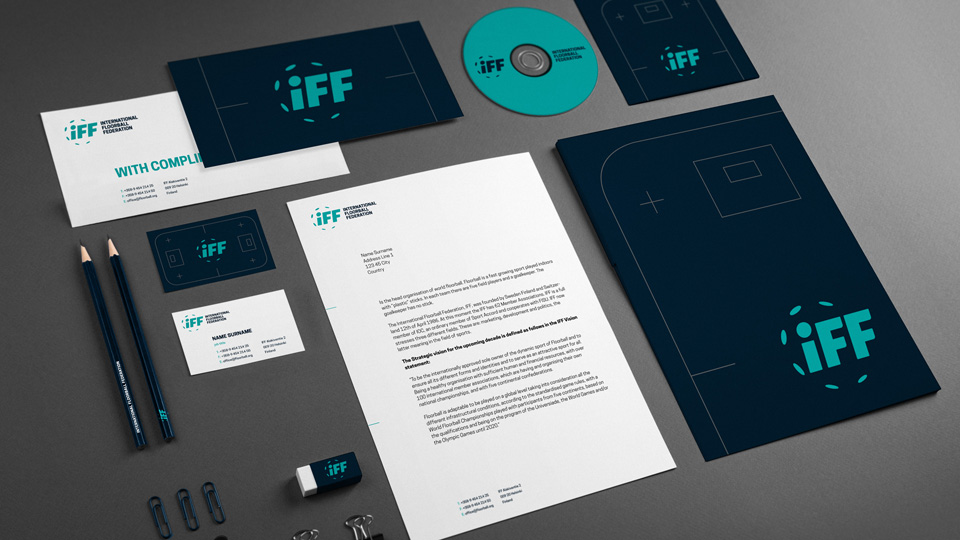 - We have designed the IFF logo as a radical facelift to the previous one. We knew we had to strip it down to the basics while underscoring the obvious dynamics of the game of floorball. We achieved this with the lean and slightly skewed typography placed off the center of the ball (the Earth). The dominant color is the signature turqouise that is used for floorball surfaces. Combined with dark blue it commands a nice contrast and fresh sporting look.